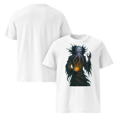 Dieses Bio-T-Shirt zeigt ein düsteres Fantasy-Motiv im Lovecraft-Stil: eine geheimnisvolle Kreatur mit Tentakelgesicht, dunkler Robe und einer leuchtenden Sphäre in der Hand. Das Design vermittelt Mystik, Macht und Horror-Atmosphäre zugleich. Auf weißem Stoff hebt sich die dunkle Figur besonders stark ab und wirkt dadurch noch intensiver. Gefertigt aus 100 % zertifizierter Bio-Baumwolle, überzeugt das Shirt durch hohen Tragekomfort, Nachhaltigkeit und langlebige Qualität. Ein Must-have für Fans von H. P. Lovecraft, Cthulhu-Mythos, Fantasy und düsteren Designs.