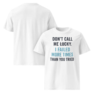 „Don’t call me lucky. I failed more times than you tried.“ – Dieses Design ist ein kraftvolles Statement für alle, die wissen, dass echter Erfolg nicht vom Glück abhängt, sondern von harter Arbeit, Rückschlägen und Durchhaltevermögen. Mit durchgestrichenem „LUCKY“ und einer klaren Message wird dieses Shirt zum Motivationsbooster für Macher und Macherinnen.