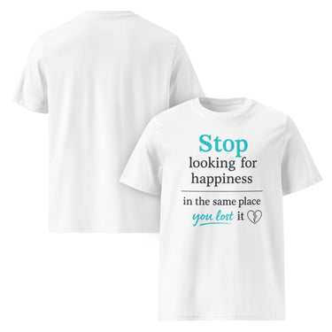Stop looking for happiness where you lost it – emotionales Zitat über Loslassen & Neubeginn, Statementshirt in Weiß